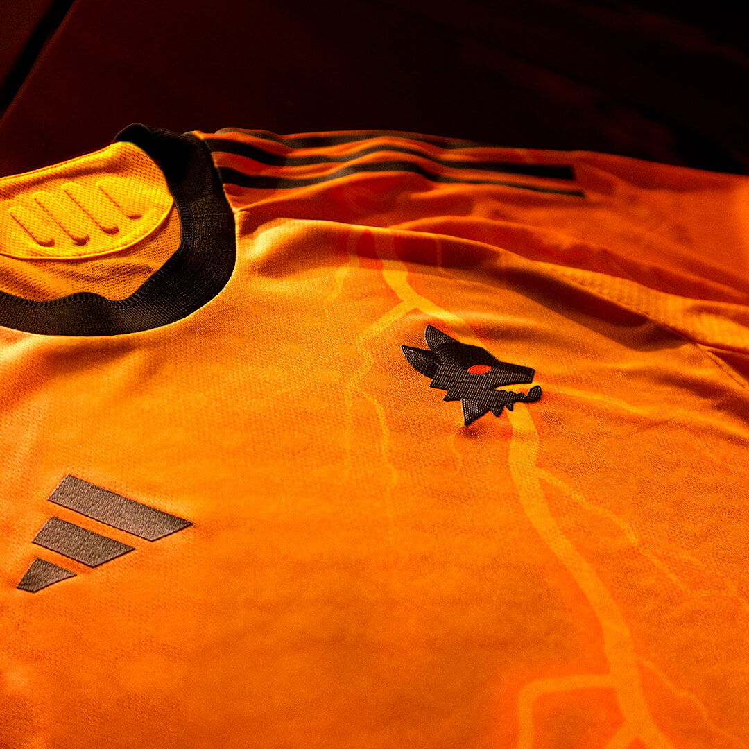 🐺 Emblemas marcantes: Escudo oficial da AS Roma, logo da Adidas e o novo patrocinador com a icônica cabeça de lobo estilizada.