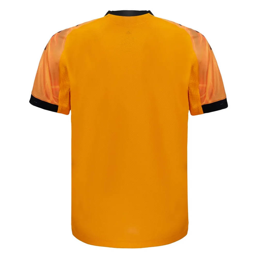🔥 Design autêntico: Predominantemente laranja, com detalhes em preto e um padrão de raios que simboliza a força e a energia da equipe.