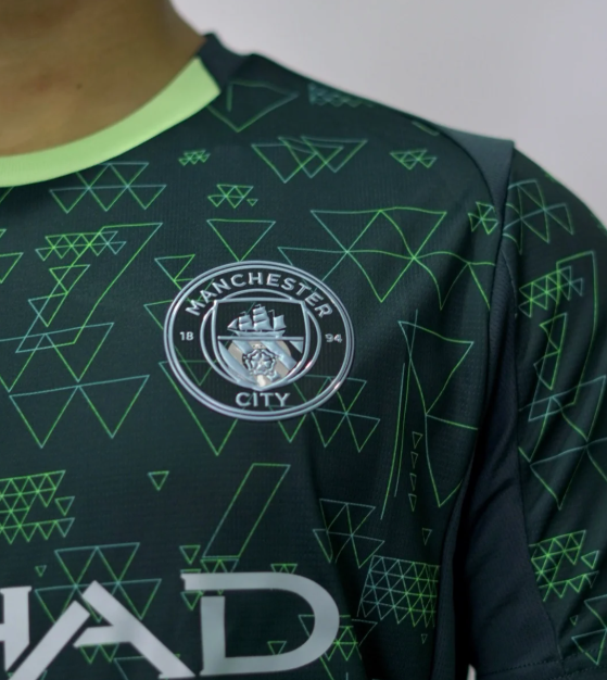 A imagem mostra a camisa oficial masculina do Manchester City, terceiro uniforme da temporada 2024/2025, perfeita para colecionadores e torcedores apaixonados pelos Citizens!